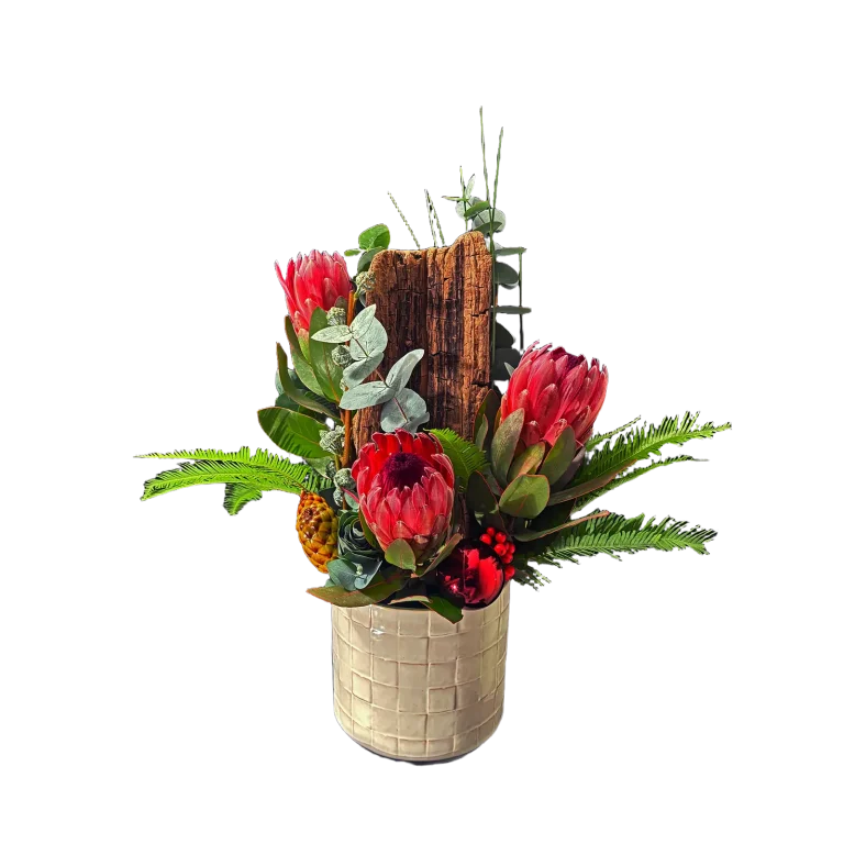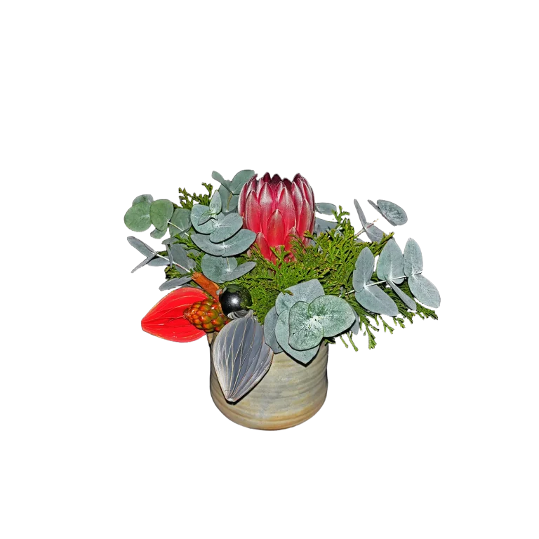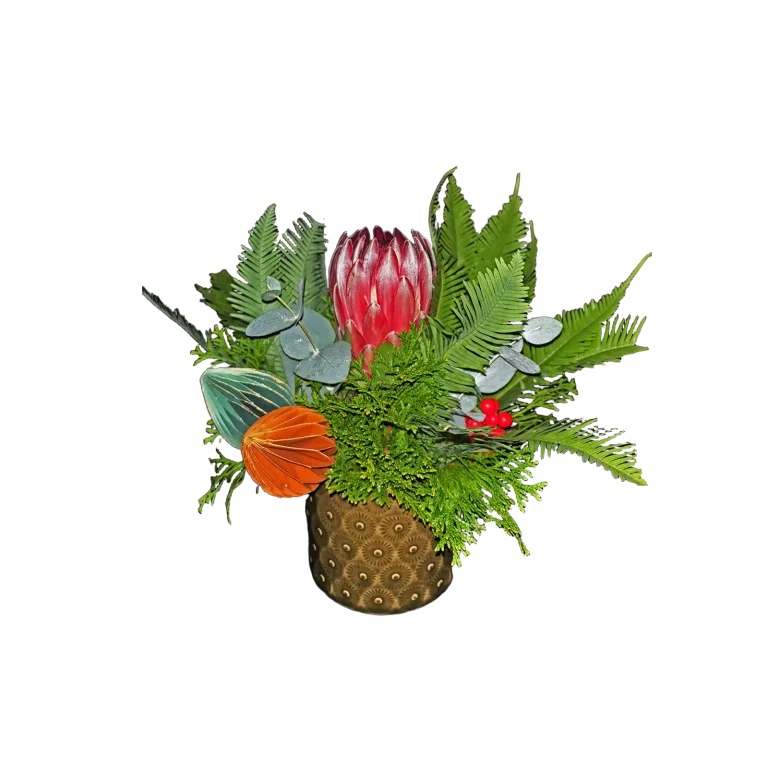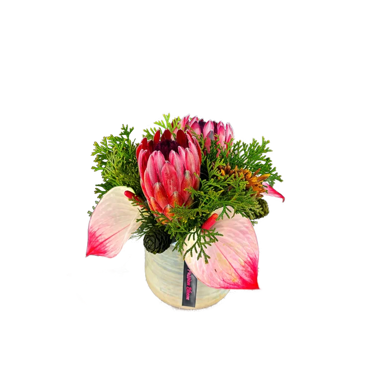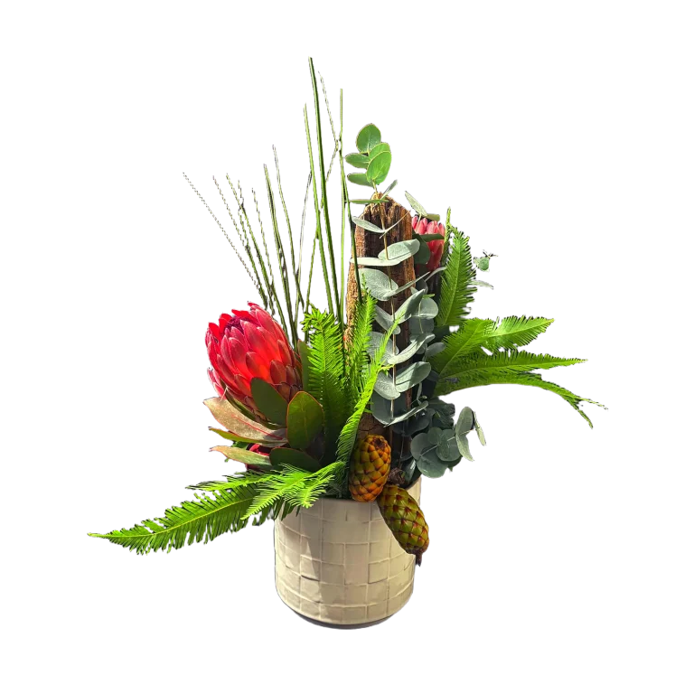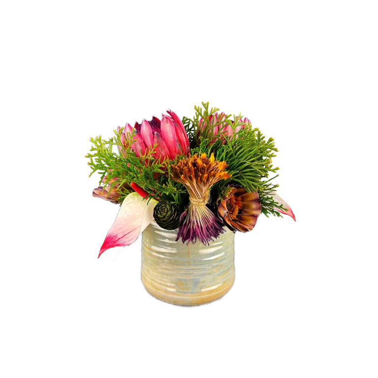 A contemporary botanical arrangement that honors nature’s ancestral beauty through a sculptural blend of proteas, organic textures, and earthy hues. Designed with a strong spiritual presence, it celebrates the connection to the earth and the art of blooming with intention. Every detail evokes balance and a timeless, wild elegance, making it an ideal centerpiece or a deeply meaningful gift.