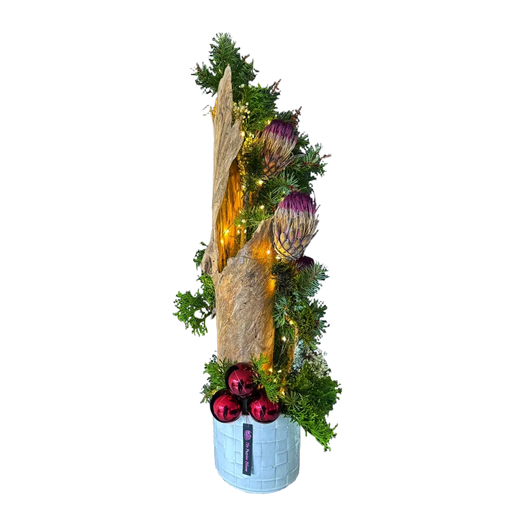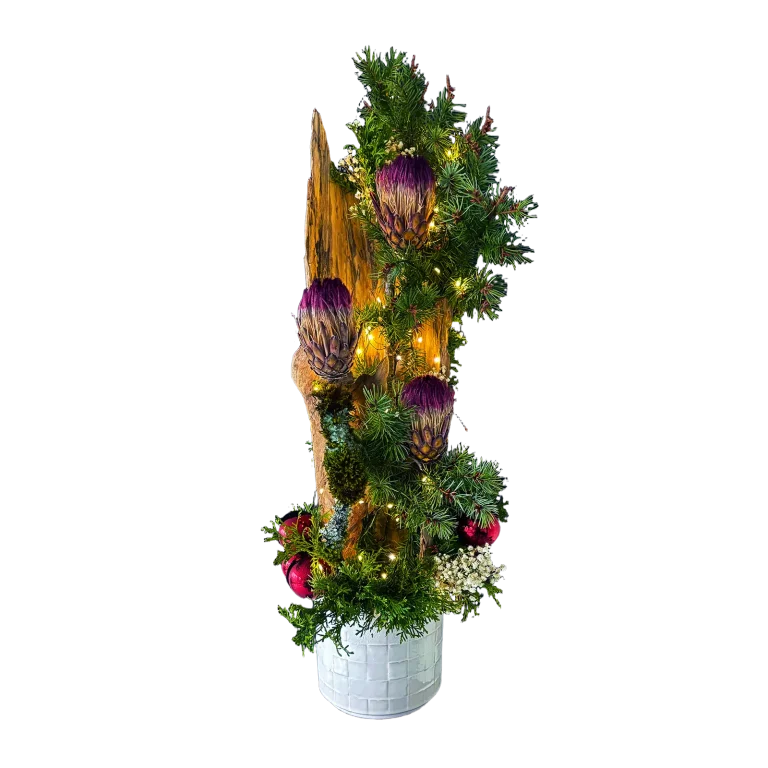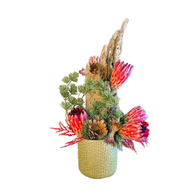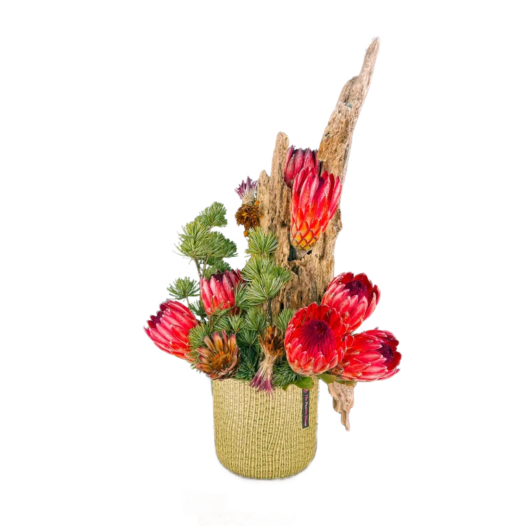 A vertical sculptural arrangement that embodies an ancestral spirit, featuring natural wood as a central axis surrounded by proteas and foliage like living offerings. This ceremonial piece symbolizes strength and reverence for the organic, transcending traditional decor to become a profound visual and emotional experience. It is the perfect statement piece for contemporary interiors or high-end editorial spaces.